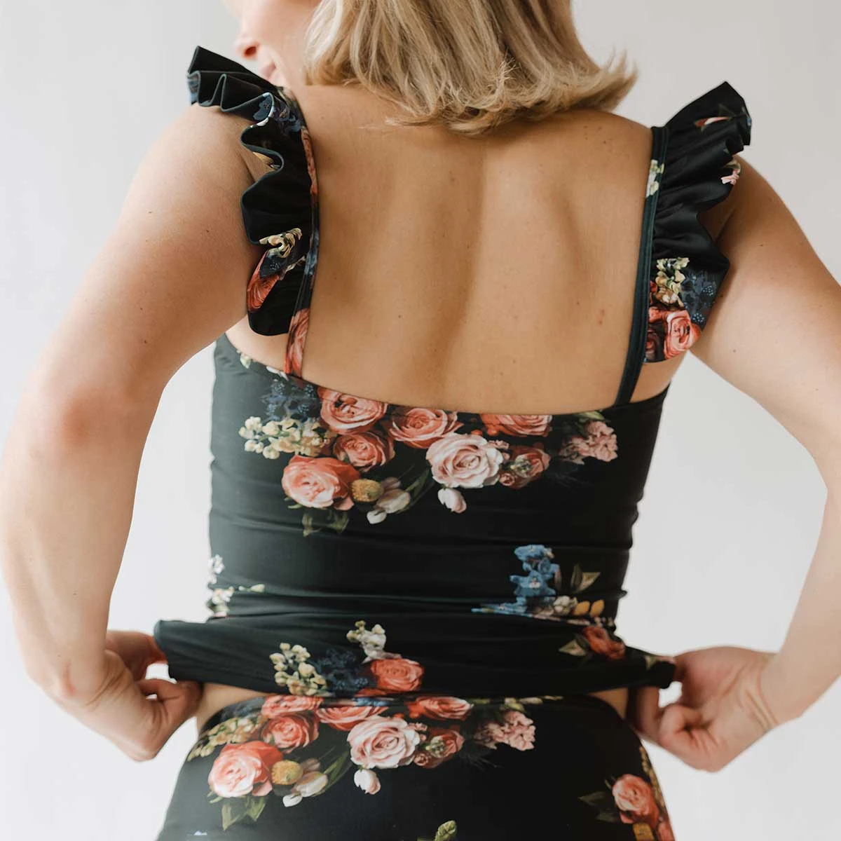 Up your swim style with our Bella Tankini in Rose Black! Perfect for mixing and matching with your favorite bottoms, this tankini top offers a bit more coverage complete with our gorgeous black rose print and oh-so-romantic ruffle straps.