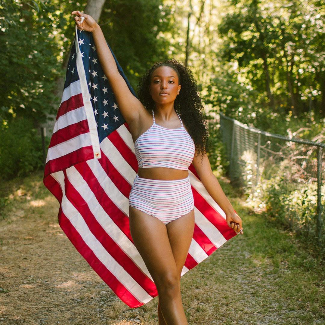 One of our most customizable tops! This red, white, and blue crop bikini top is the ultimate patriotic women’s swimsuit and its easily adjustable for a custom fit every time you hit the pool.