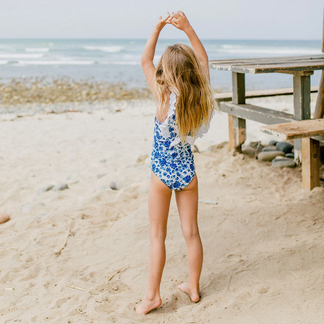 Our sweet, girly Mini Ruffle in our Santorini print? Match made in Mediterranean heaven! This one-piece is the perfect toddler swimsuit, right down to the bow in the back. If matching kids swimsuits are your dream, this blue and white floral is the ultimate “mommy and me” print—older sisters will love our Olivia Two-Piece Set or the Mini Rash Guard Set, and mom will look gorgeous in her