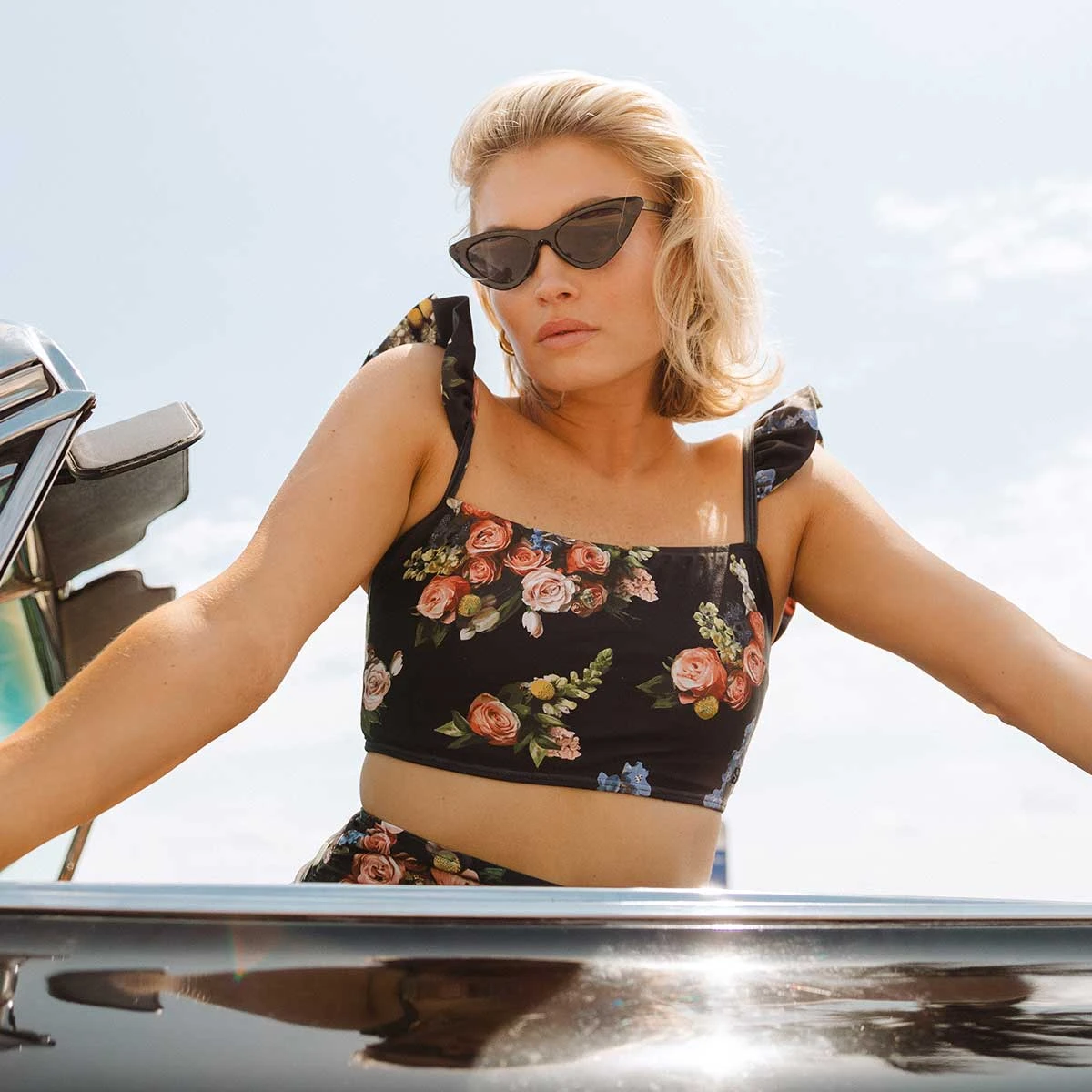 Get ready to bloom in our Bella Crop Top! Featuring a striking black rose print and dainty ruffle straps, this women’s bikini top combines comfort with style for a timeless look you’ll be reaching for year after year.